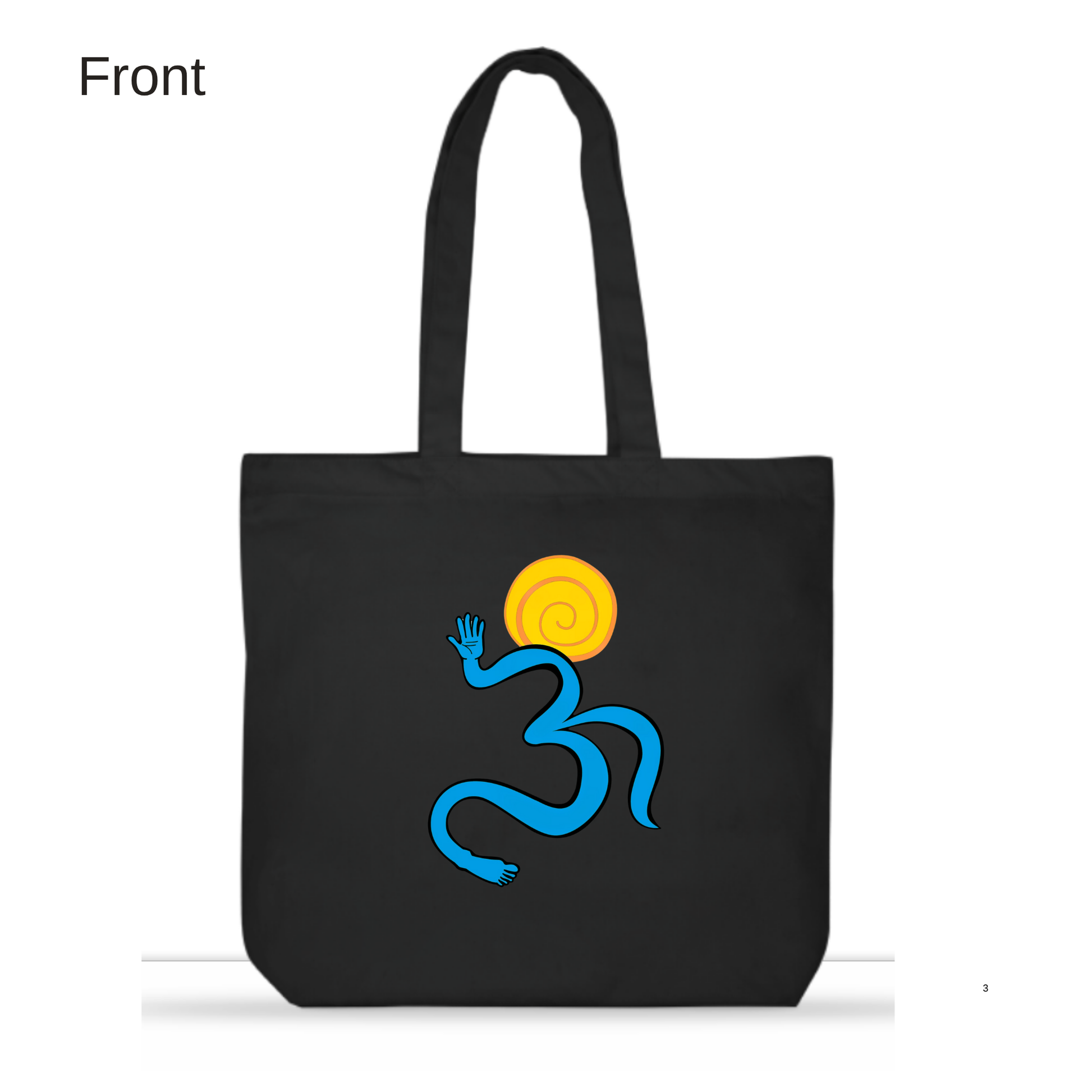 This bold black tote features a striking abstract rendition of “Om” – blending traditional symbolism with a playful modern twist. The swirling yellow crown, the open hand, and fluid blue lines give this sacred symbol a desi-cool makeover.