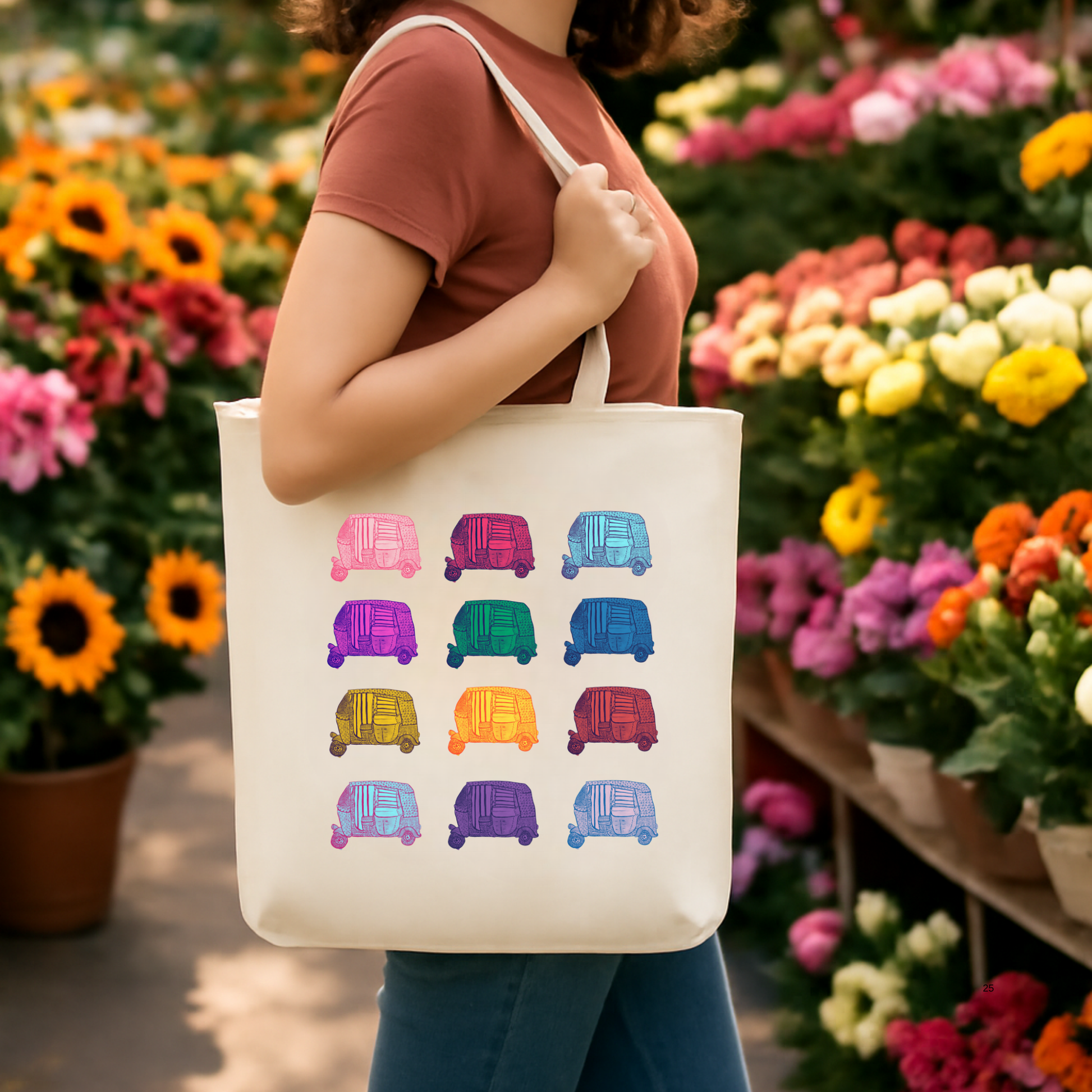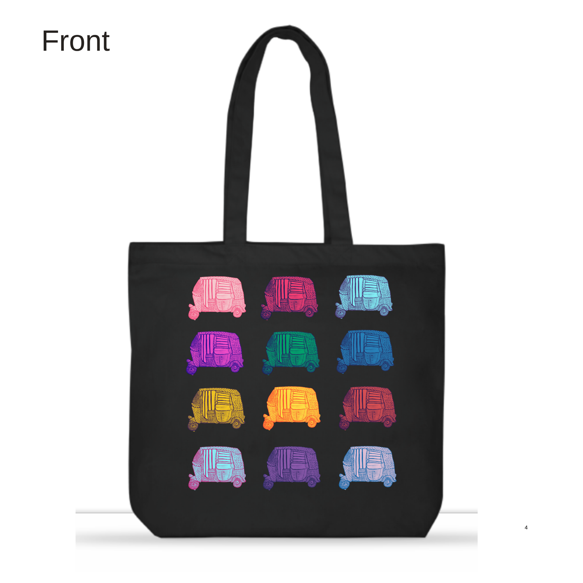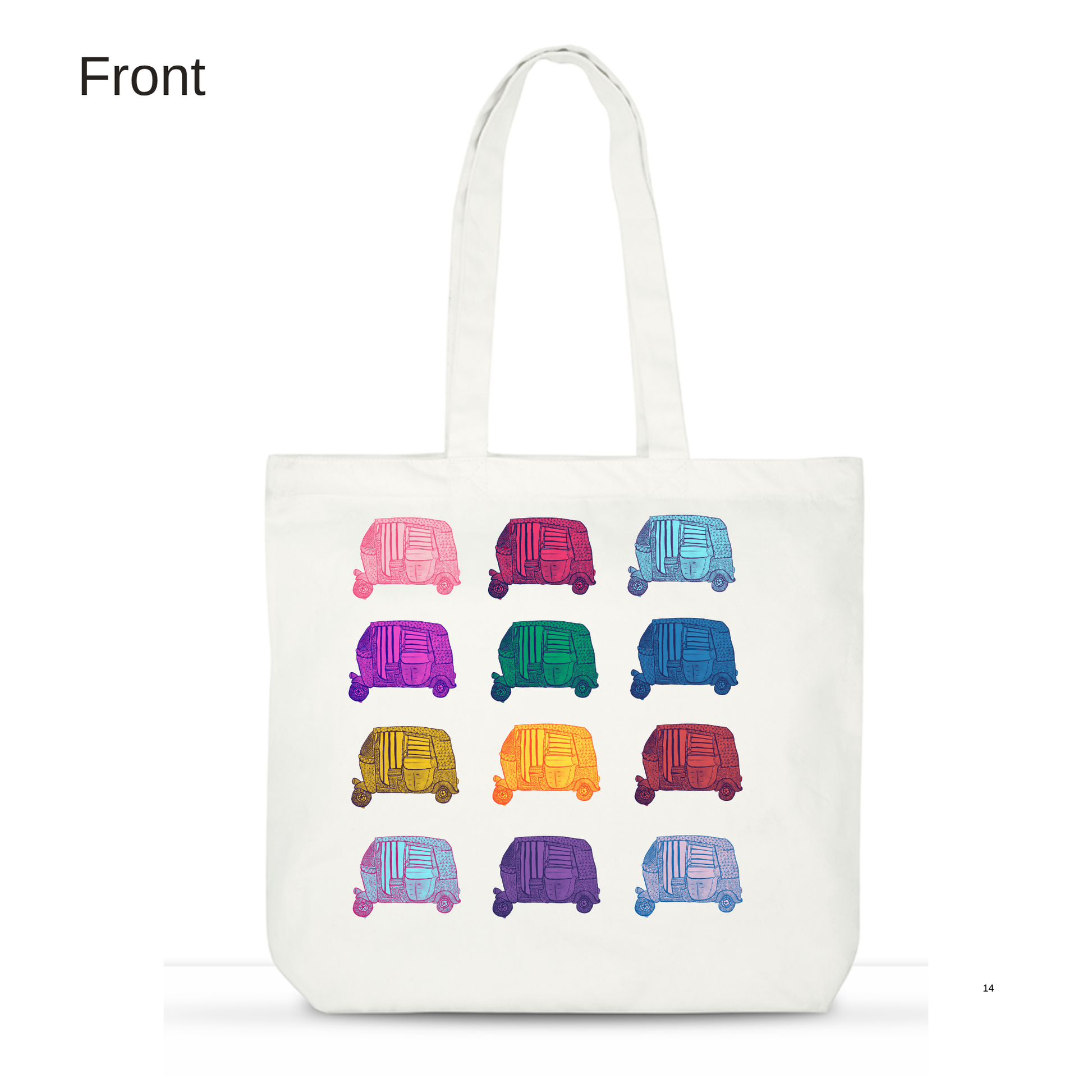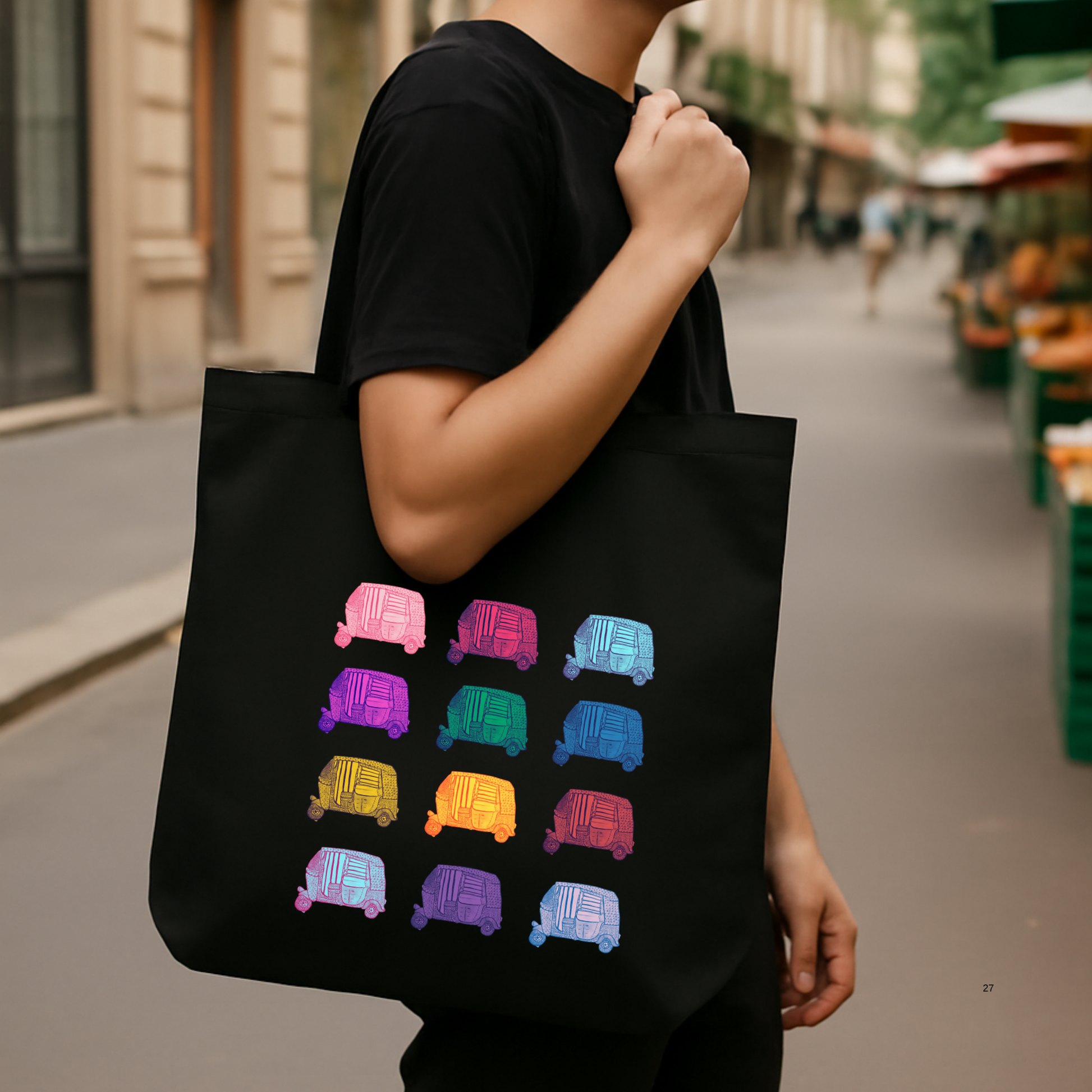 Rickshaw Riot is a head-turning mashup of Madhubani art and pop-culture energy. Featuring a vibrant grid of colorful hand-drawn rickshaws, this tote brings a punch of desi nostalgia with a bold, modern edge. Perfect for those who carry more than just essentials – they carry stories.